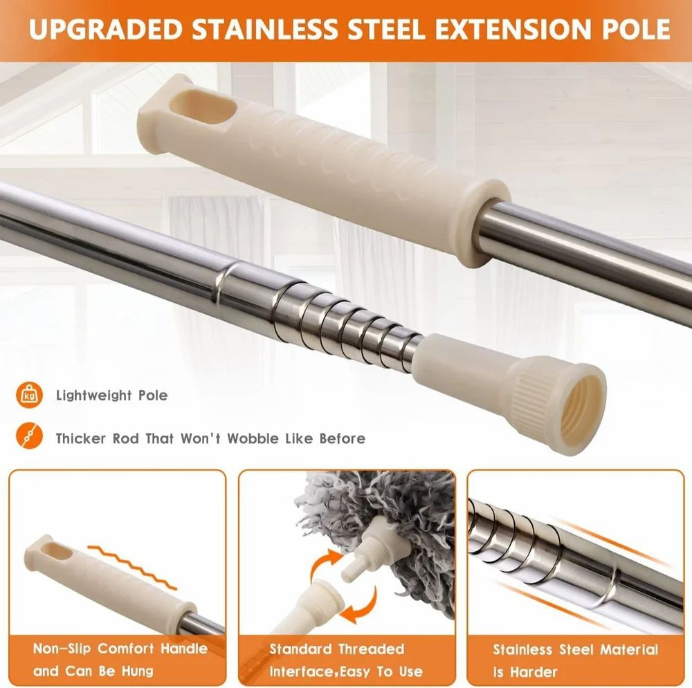 نظّف الأماكن العالية بسهولة مع منفضة غبار بقطب ستانلس ستيل قابل للتمديد من 30 إنش حتى 100 إنش، مزوّدة برأس مايكروفايبر مرن يلتقط الغبار والشعر بدقة ويُستخدم جافًا أو مبللاً.