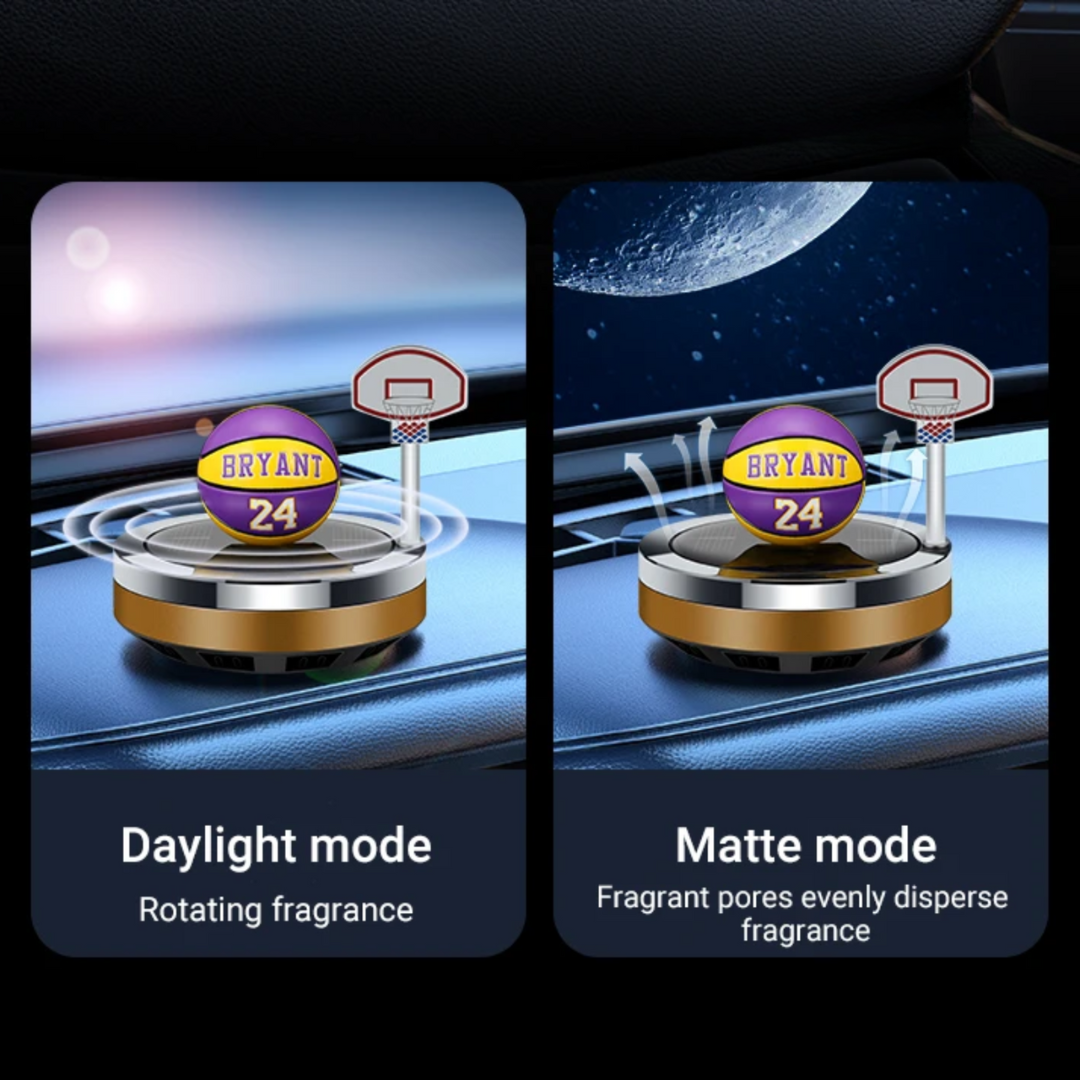 A solar-powered basketball-shaped car diffuser made of high-quality aluminum alloy, resistant to rust and high temperatures. It features solar technology, allowing it to rotate automatically when exposed to light, helping to distribute fragrance and purify the air inside the car. Its compact design makes it a stylish and functional addition to the dashboard, perfect for car and basketball enthusiasts.