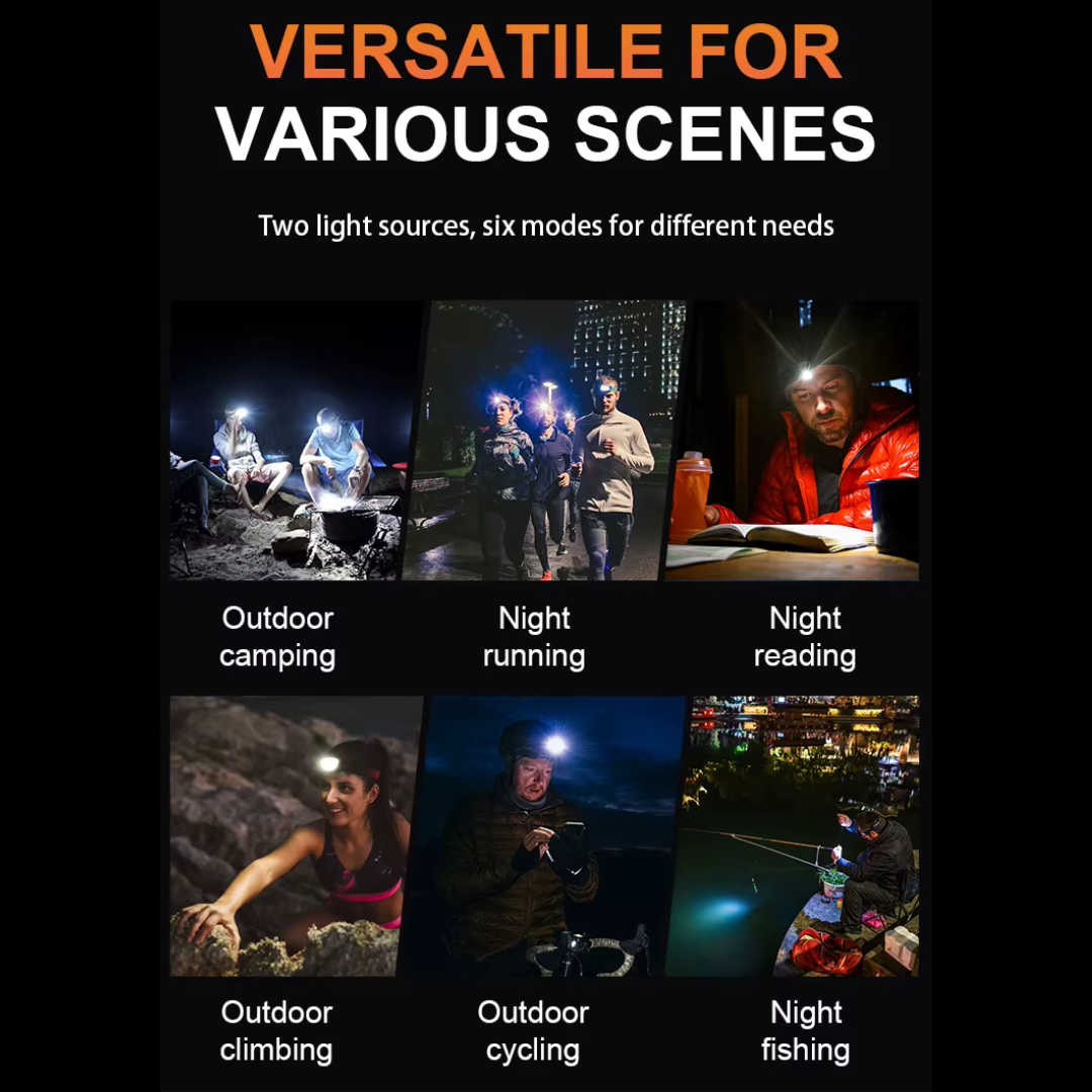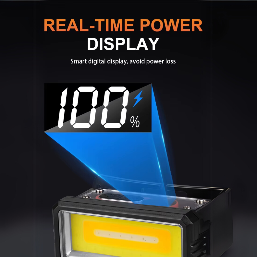 مصباح رأس ذكي بشاشة عرض، مقاوم للماء (IP65)، بإضاءة LED قوية وقابلة لإعادة الشحن عبر USB-C. مثالي للتخييم، الصيد، الجري، والمزيد. بطارية ليثيوم أيون 1200mAh تدوم طويلاً مع إضاءة قابلة للتعديل وضوء أحمر للوضع الليلي.